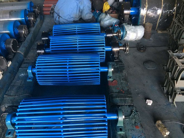 鼓型排渣滾筒系列兩端設(shè)置倒錐體結(jié)構(gòu),接觸面采用輪幅式,便于物料特別是大塊物料的排除,在輪幅工作面通過(guò)特殊工藝包覆聚氨酯彈性體耐磨材料,以利于提高耐磨性能及清掃效果,完全保護(hù)滾筒和膠帶,接觸面采用鼓型結(jié)構(gòu),可起到糾偏作用。